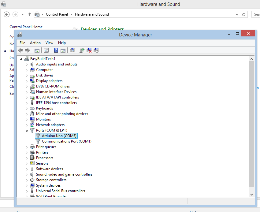 I had to identify the port (USB) that my Arduino Uno was plugged into, in my case COM5. You can discover which port to use by opening your control panel and going into your device manager. The COM will be displayed next to your device as demonstrated below.